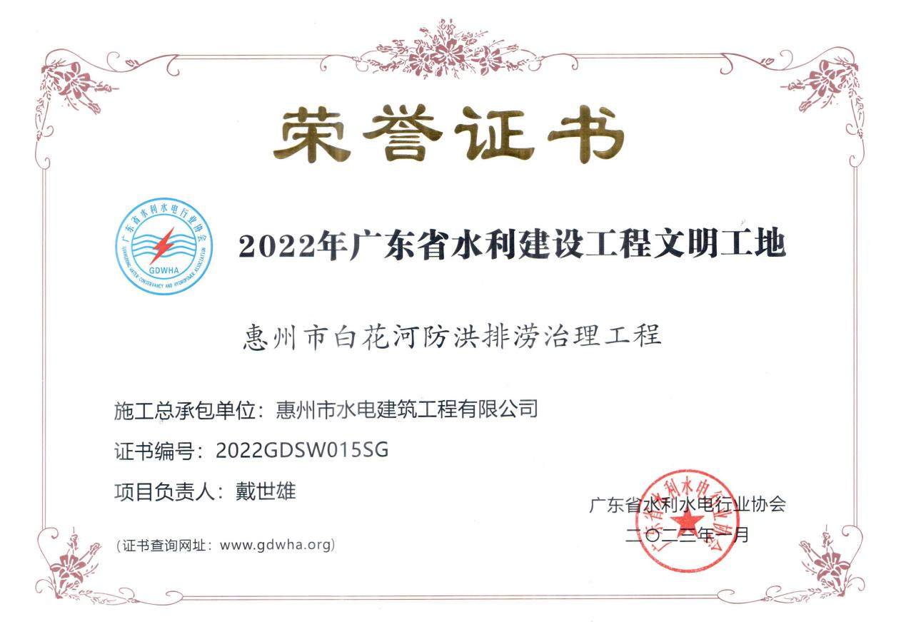 近日,我司承建的惠州市白花河防洪排澇治理工程經(jīng)廣東省水利水電行業(yè)協(xié)會(huì)組織行業(yè)專(zhuān)家評(píng)審組評(píng)審?fù)ㄟ^(guò),順利獲得“2022年廣東省水利建設(shè)工程文明工地”榮譽(yù)稱(chēng)號(hào)。這是公司貫徹落實(shí)市水務(wù)集團(tuán)精細(xì)管理要求,不斷拓展高質(zhì)量發(fā)展空間的又一工作成果?;葜菔邪谆ê臃篮榕艥持卫砉こ獭?.....