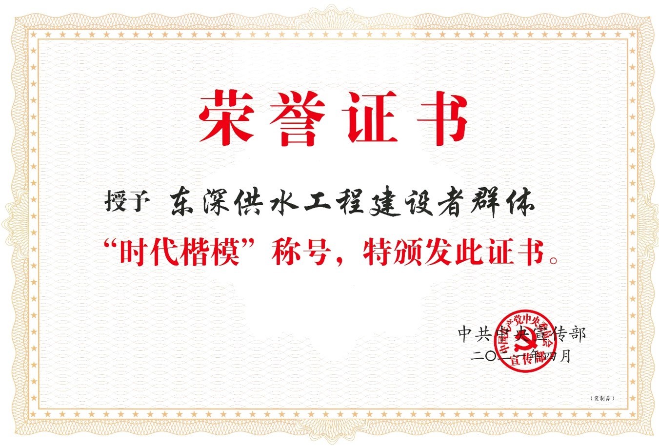 2021年4月,中共中央宣傳部授予東深供水工程建設(shè)者群體“時代楷?!狈Q號,褒揚(yáng)他們是“建設(shè)守護(hù)香港供水生命的光榮團(tuán)隊”。近日,市水電公司收到“時代楷?!睒s譽(yù)證書及牌匾,這是屬于全體建設(shè)者的榮譽(yù),也是給予市水電公司的一份無上榮光。東江—深圳供水工程(簡稱“東深供水…......