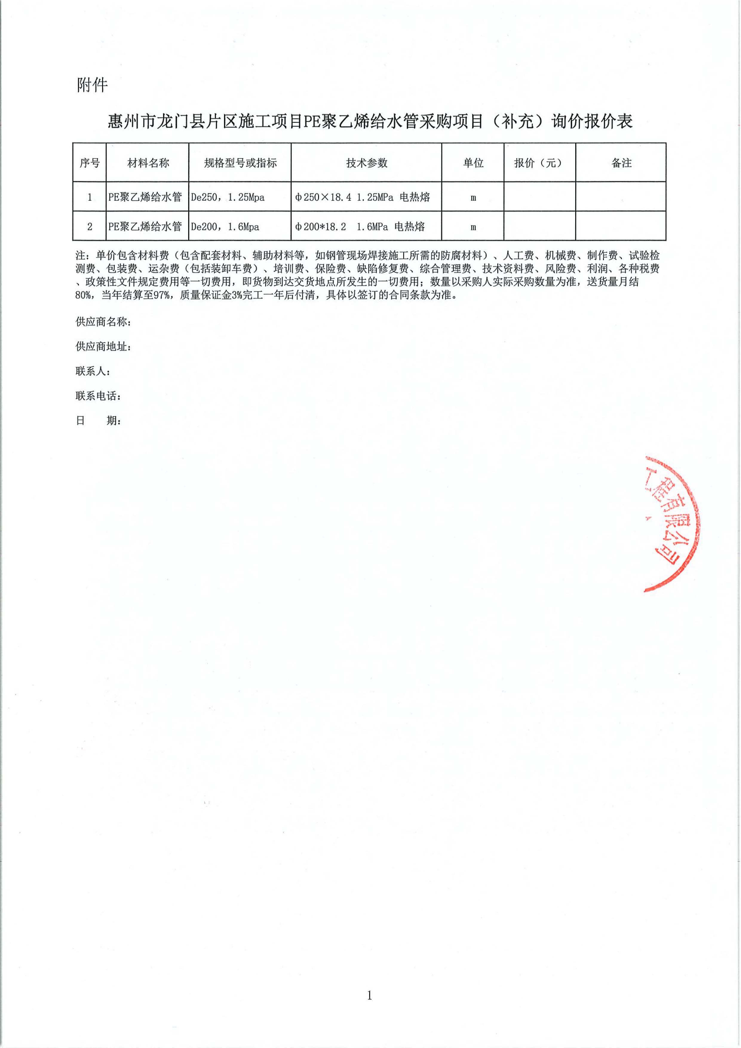 惠州市龍門縣片區(qū)施工項(xiàng)目PE聚乙烯給水管采購(gòu)項(xiàng)目(補(bǔ)充)詢價(jià)公告