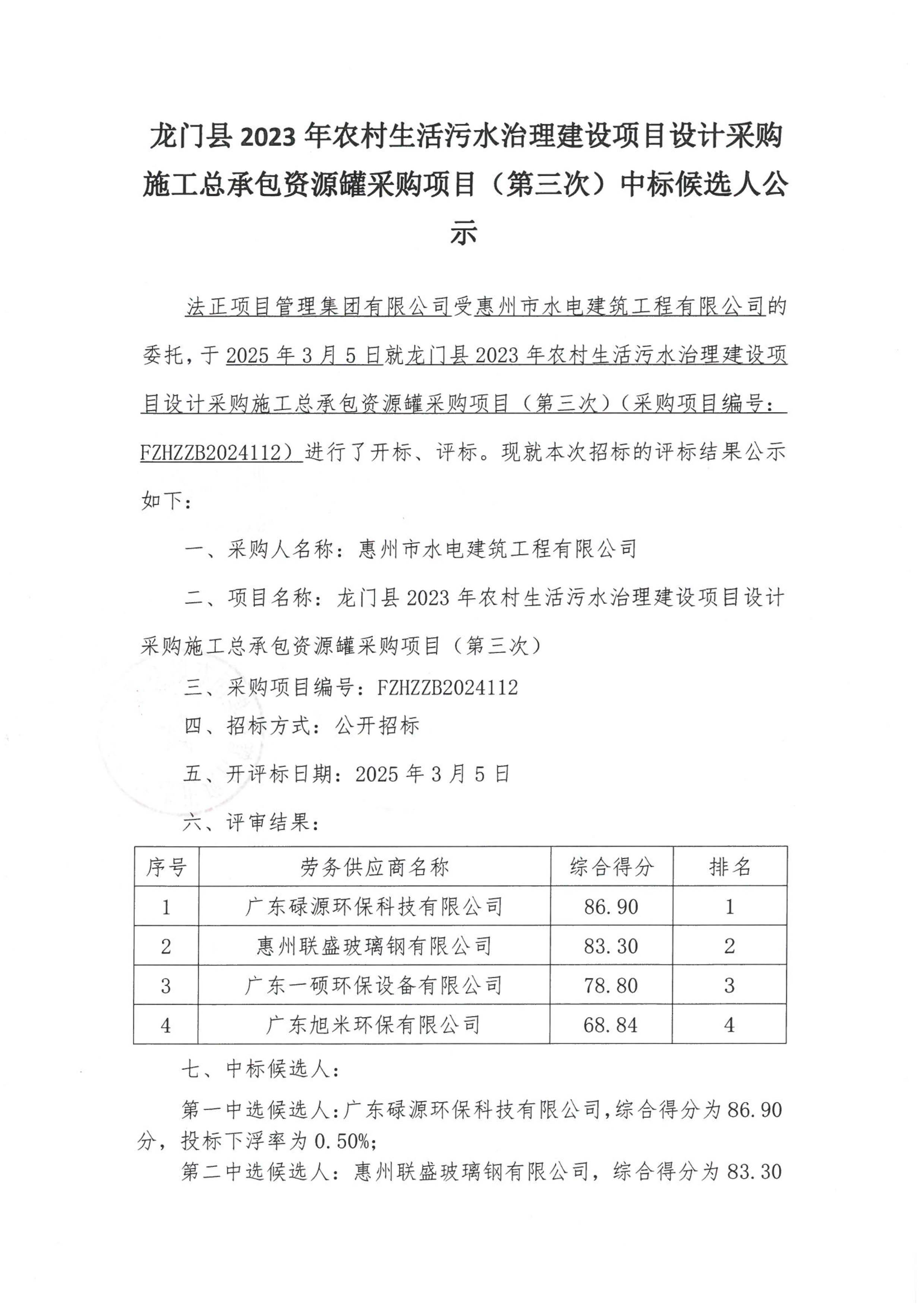 龍門縣2023年農(nóng)村生活污水治理建設(shè)項目設(shè)計采購施工總承包資源罐采購項目(第三次)中標候選人公示