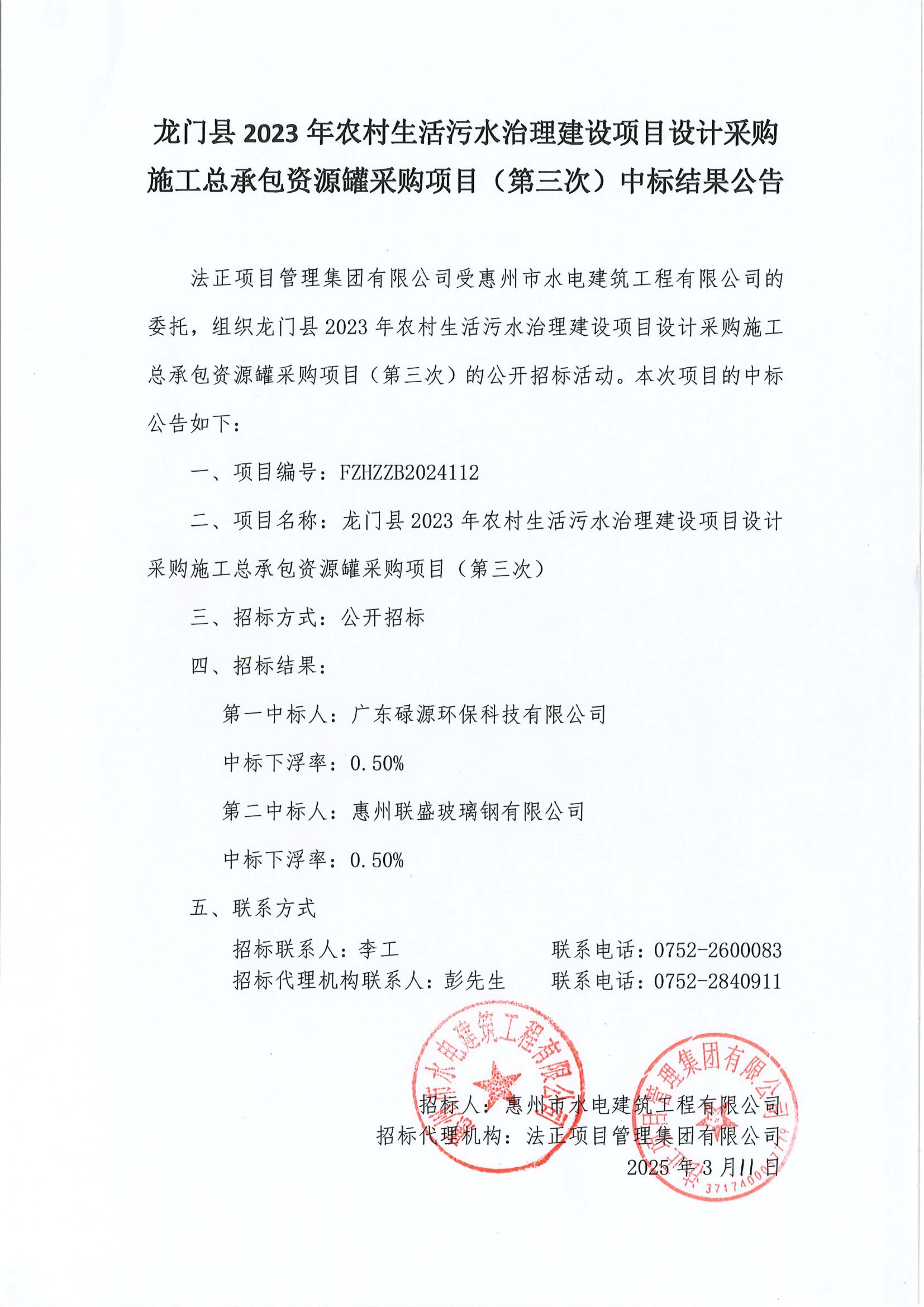 龍門縣2023年農(nóng)村生活污水治理建設(shè)項目設(shè)計采購施工總承包資源罐采購項目(第三次)中標(biāo)結(jié)果公告