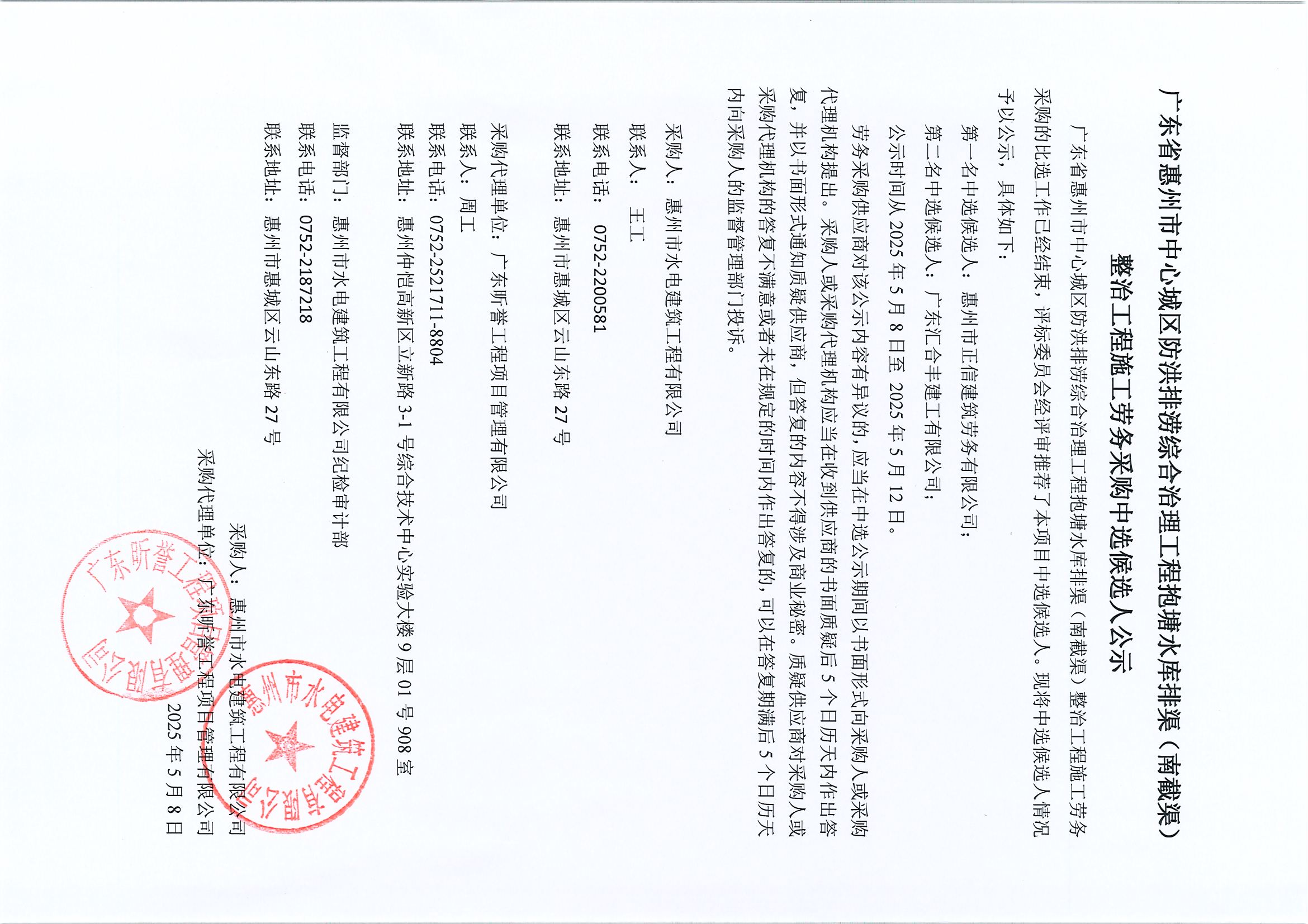 廣東省惠州市中心城區(qū)防洪排澇綜合治理工程抱塘水庫排渠(南截渠)整治工程施工勞務(wù)采購中選候選人公示