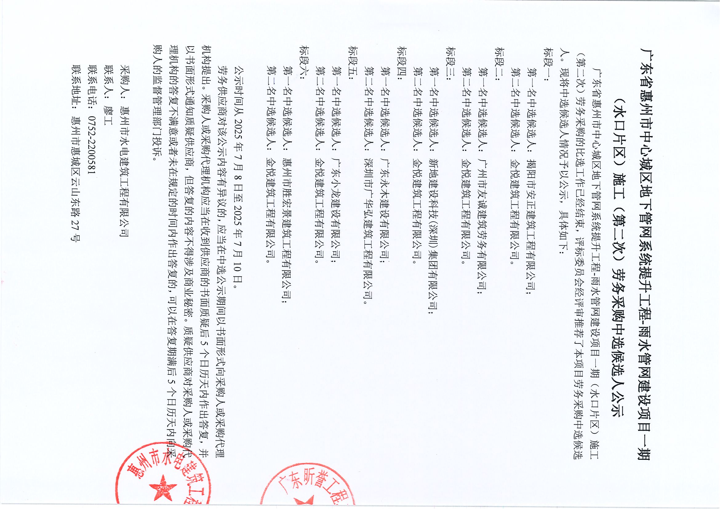 廣東省惠州市中心城區(qū)地下管網(wǎng)系統(tǒng)提升工程-雨水管網(wǎng)建設(shè)項(xiàng)目一期(水口片區(qū))施工(第二次)勞務(wù)采購(gòu)中選候選人公示