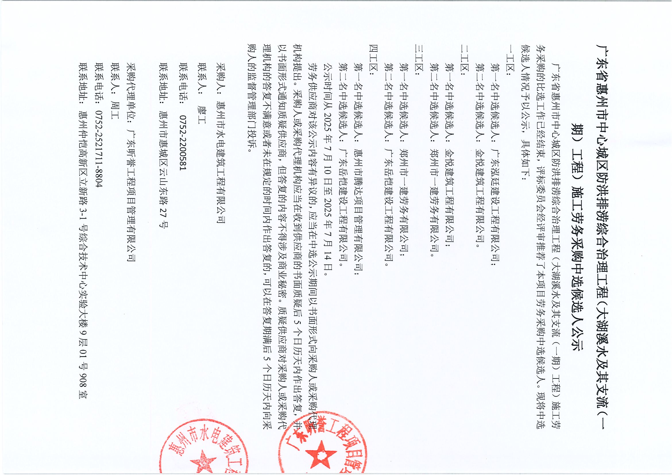 廣東省惠州市中心城區(qū)防洪排澇綜合治理工程(青邊瀝治理(一期)工程)施工勞務(wù)采購中選候選人公示