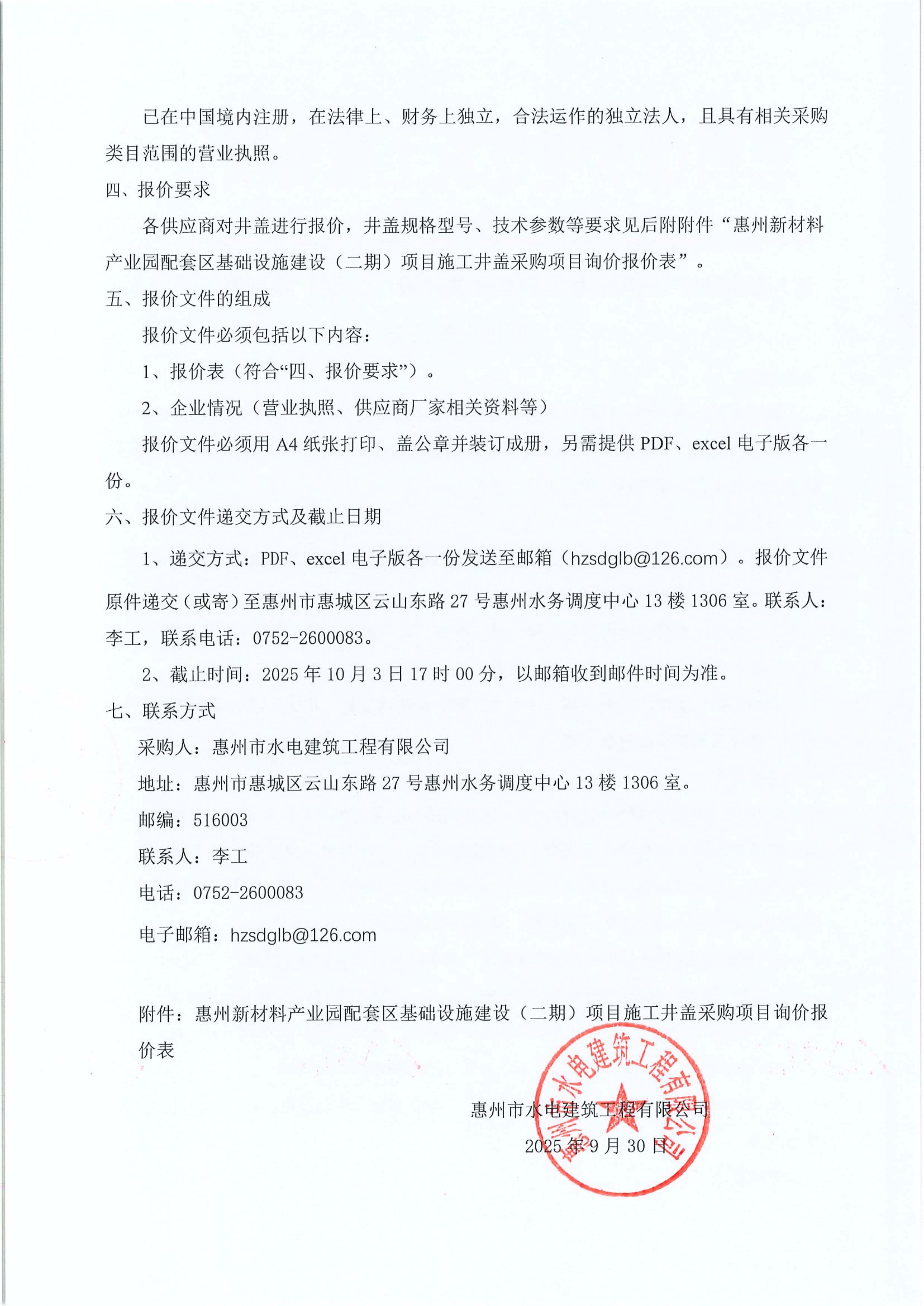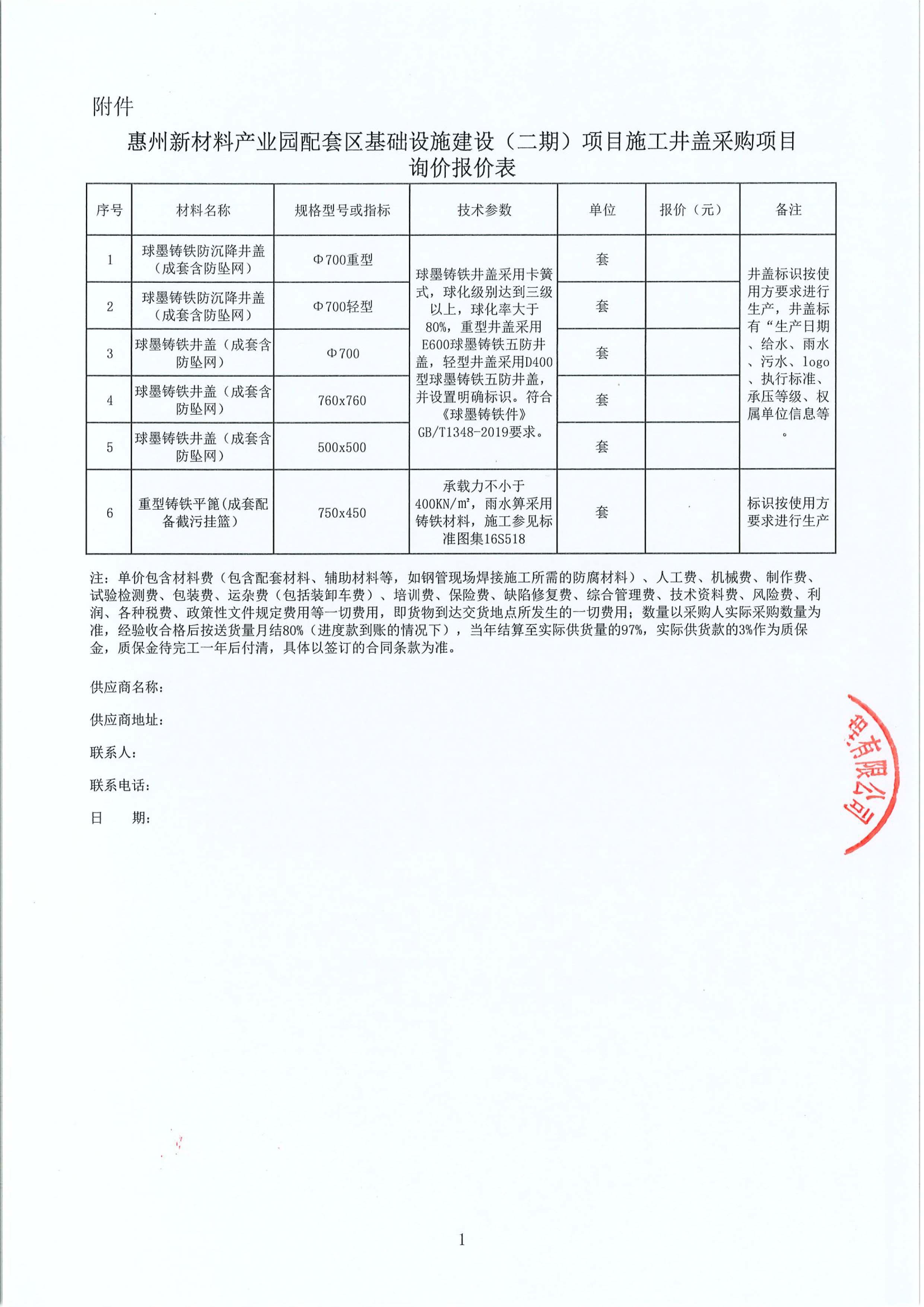 惠州新材料產(chǎn)業(yè)園配套區(qū)基礎設施建設(二期)項目施工井蓋采購項目詢價公告附件: