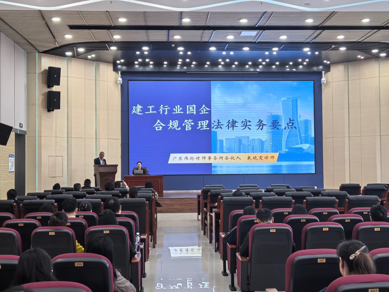 為進(jìn)一步強(qiáng)化集團(tuán)合規(guī)管理體系建設(shè),提升建設(shè)工程領(lǐng)域風(fēng)險(xiǎn)防控能力,11 月 21 日下午,由我司主辦的“建工行業(yè)國企合規(guī)管理法律實(shí)務(wù)要點(diǎn)”專題培訓(xùn),在集團(tuán)水務(wù)調(diào)度中心三樓報(bào)告廳順利舉行。集團(tuán)總部及所屬各級企業(yè)的法務(wù)、合規(guī)、建設(shè)工程管理相關(guān)人員齊聚一堂,共同參與此次學(xué)習(xí)與交流。培訓(xùn)邀請廣東偉倫律師事務(wù)所戴曉雯律師擔(dān)任主講。