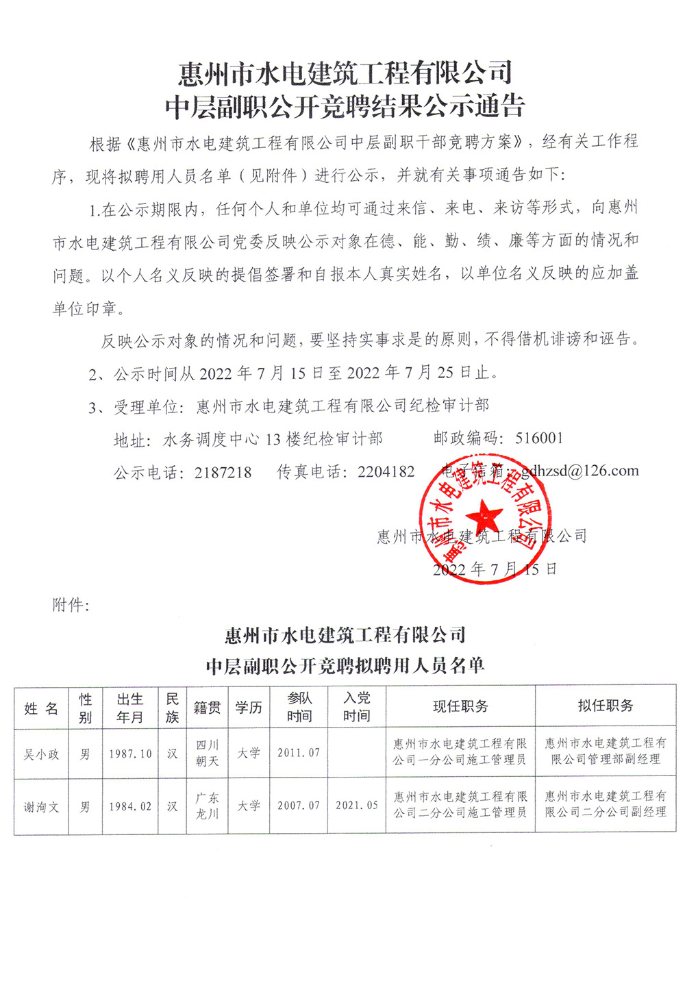惠州市水電建筑工程有限公司中層副職公開(kāi)競(jìng)聘結(jié)果公示