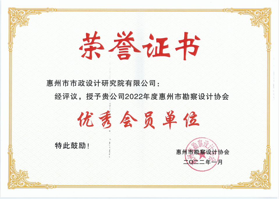 2023年2月8日,惠州市勘察設(shè)計(jì)協(xié)會五屆理事會第十二次會議在惠州市惠城區(qū)康帝酒店會議室召開,協(xié)會會長、監(jiān)事長以及理事、監(jiān)事單位等共30多人參加會議,大會頒發(fā)了2022年度惠州市勘察設(shè)計(jì)協(xié)會“優(yōu)秀會員單位”獎(jiǎng)項(xiàng)榮譽(yù)證書,惠州市市政設(shè)計(jì)研究院有限公司榮獲協(xié)會“優(yōu)秀會員單位”稱號。
