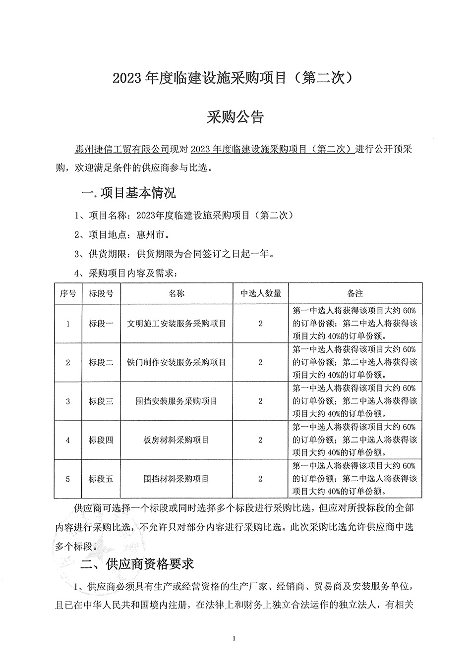 捷信工貿(mào)公司2023年度臨建設(shè)施采購項(xiàng)目(第二次)采購公告