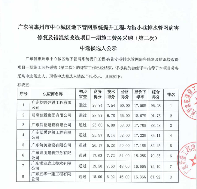 廣東省惠州市中心城區(qū)地下管網(wǎng)系統(tǒng)提升工程-內(nèi)街小巷排水管網(wǎng)病害修復(fù)及錯(cuò)混接改造項(xiàng)目一期施工勞務(wù)采購(gòu)(第二次)中選候選人公示......