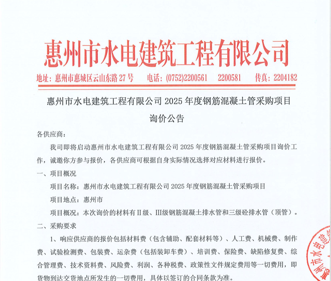 惠州市水電建筑工程有限公司2025年度鋼筋混凝土管采購(gòu)項(xiàng)目詢(xún)價(jià)公告......