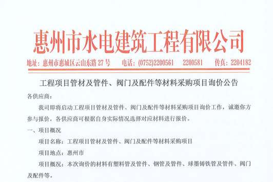 工程項(xiàng)目管材及管件、閥門(mén)及配件等材料采購(gòu)項(xiàng)目詢價(jià)公告......