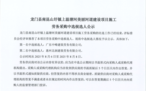龍門(mén)縣南昆山圩鎮(zhèn)上溫塘河美麗河道建設(shè)項(xiàng)目施工勞務(wù)采購(gòu)中選候選人公示......