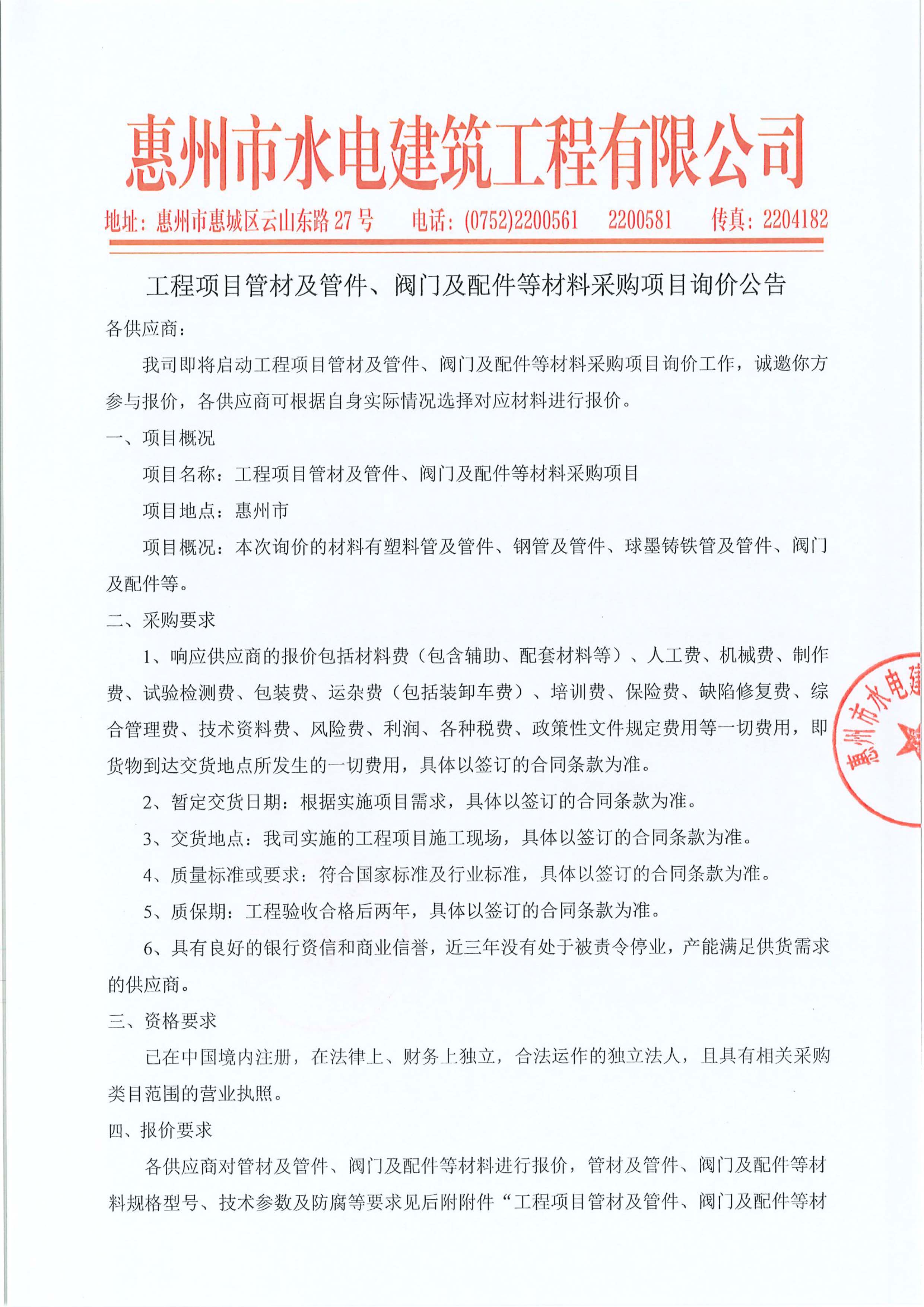 工程項目管材及管件、閥門及配件等材料采購項目詢價公告