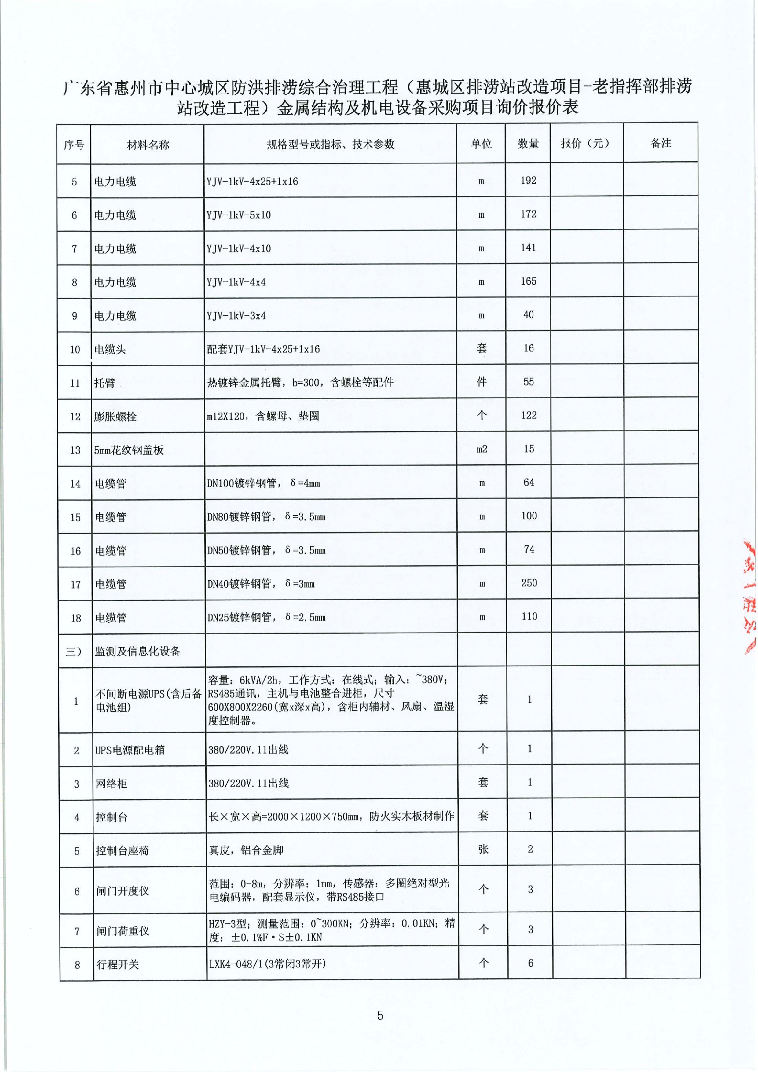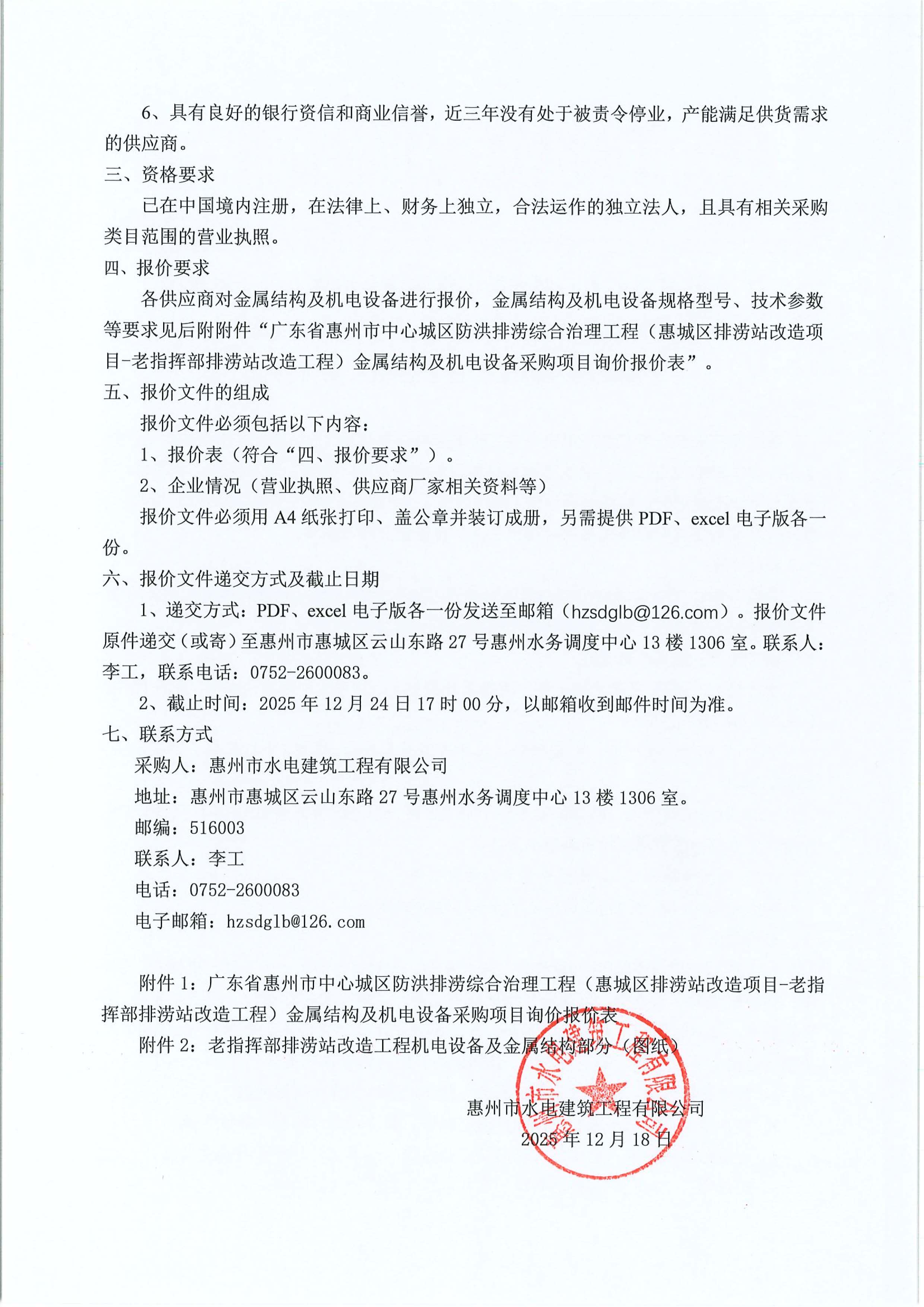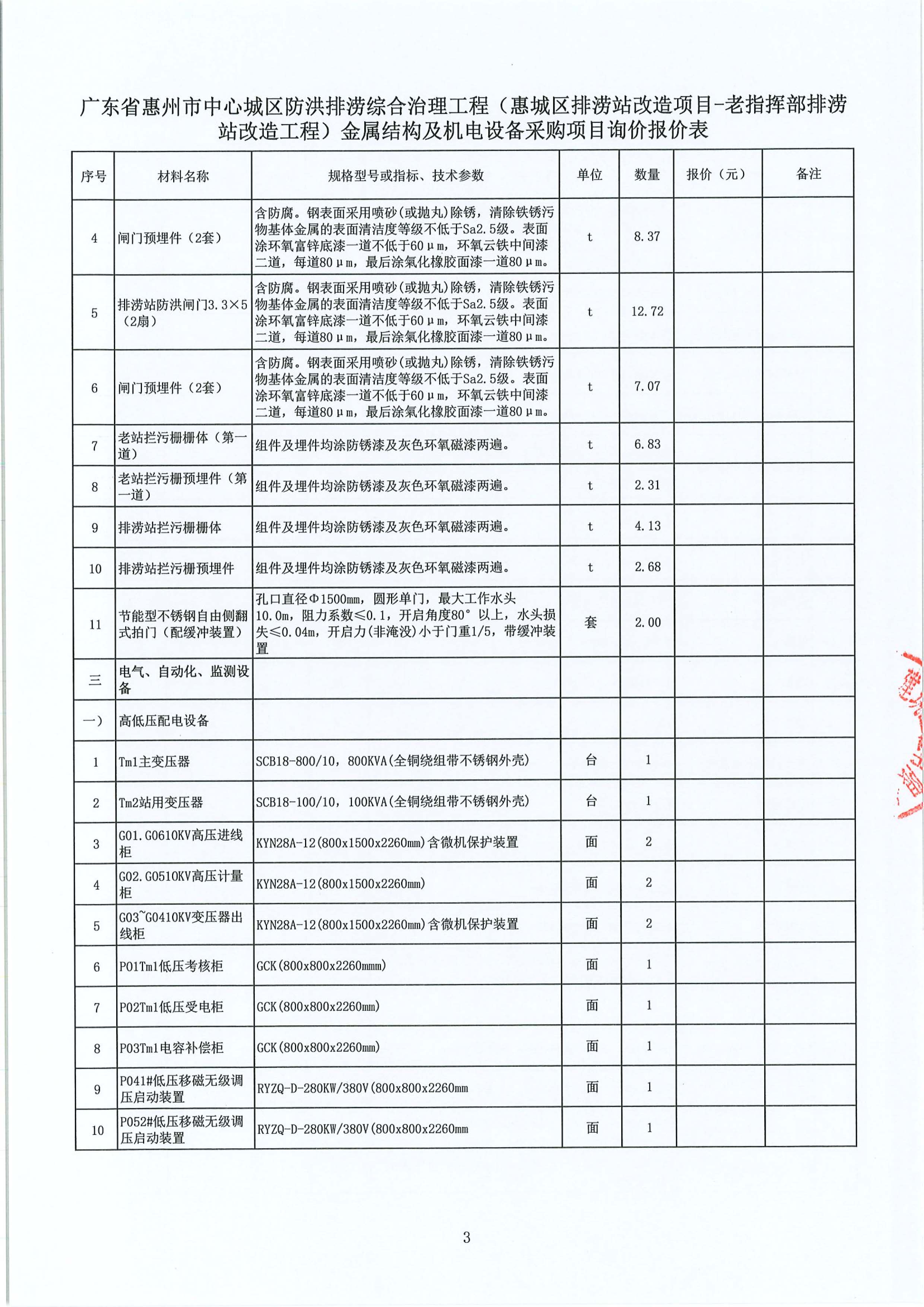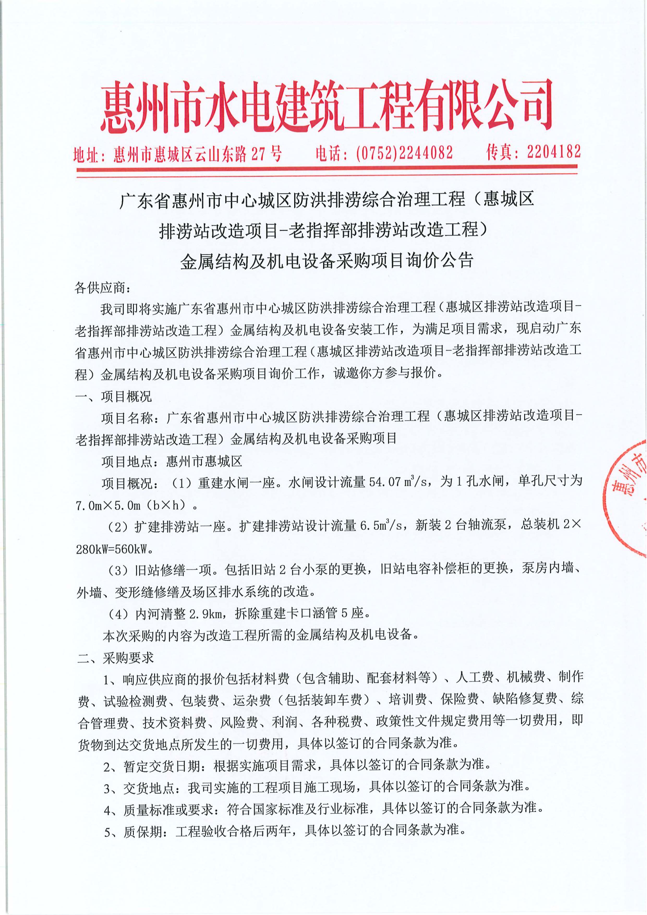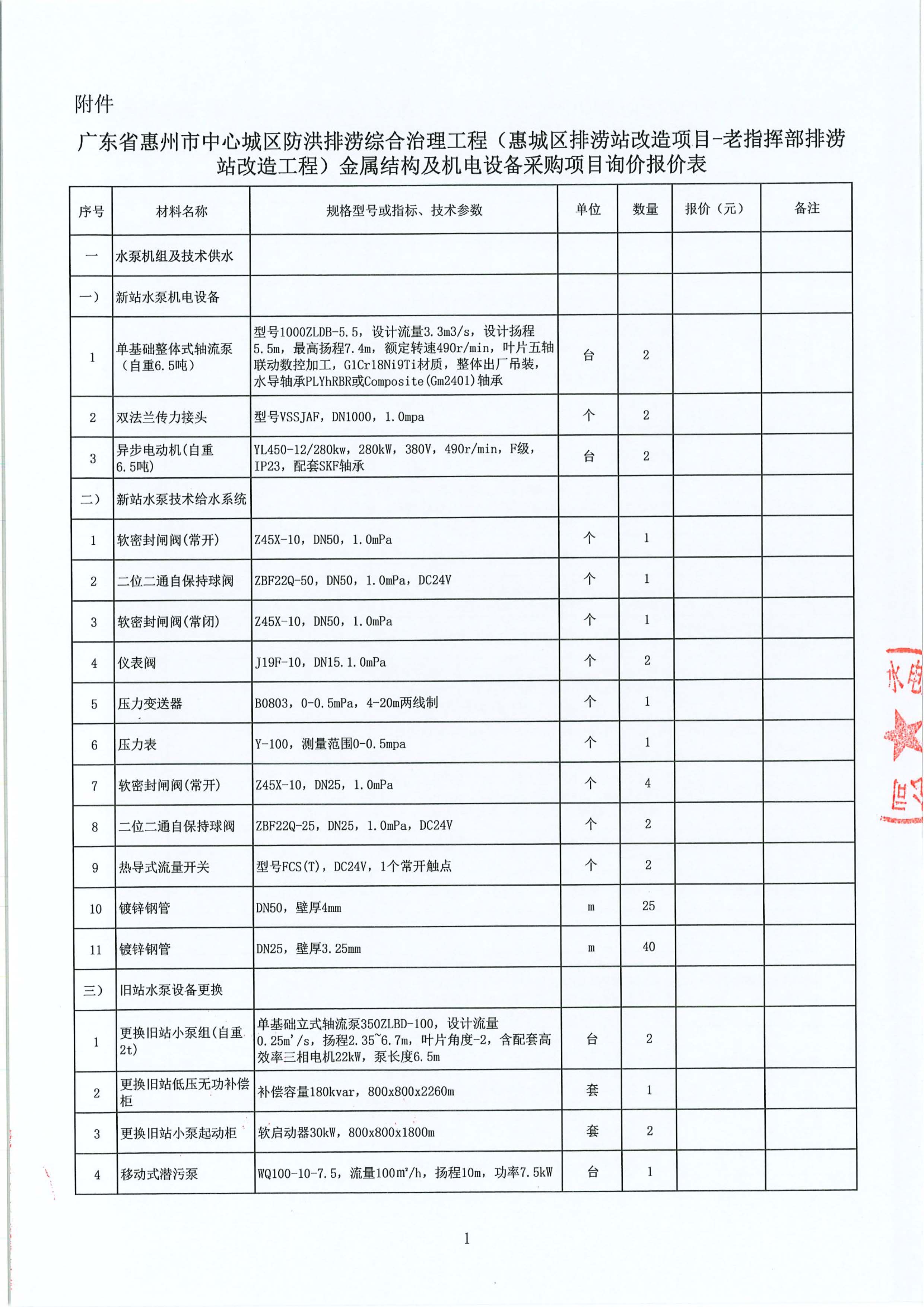廣東省惠州市中心城區(qū)防洪排澇綜合治理工程(惠城區(qū)排澇站改造項(xiàng)目-老指揮部排澇站改造工程)金屬結(jié)構(gòu)及機(jī)電設(shè)備采購項(xiàng)目詢價(jià)公告附件: