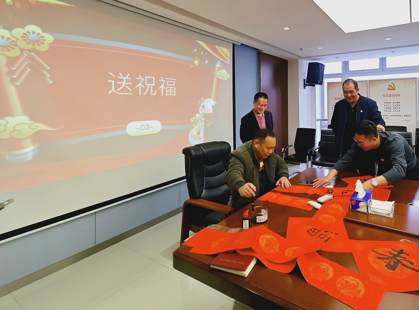 活動(dòng)末尾,送祝福環(huán)節(jié)溫馨上演。黨員們揮毫潑墨,書(shū)寫(xiě)迎春祝福語(yǔ),“金蟒迎春心守廉,紅梅映日夢(mèng)留清”“風(fēng)清氣正度佳節(jié),吉祥如意迎新春”等飽含深意的話語(yǔ)躍然紙上。這些書(shū)法作品,既傳遞新春祝福,也時(shí)刻提醒黨員堅(jiān)守廉潔底線,共度清正春節(jié)。